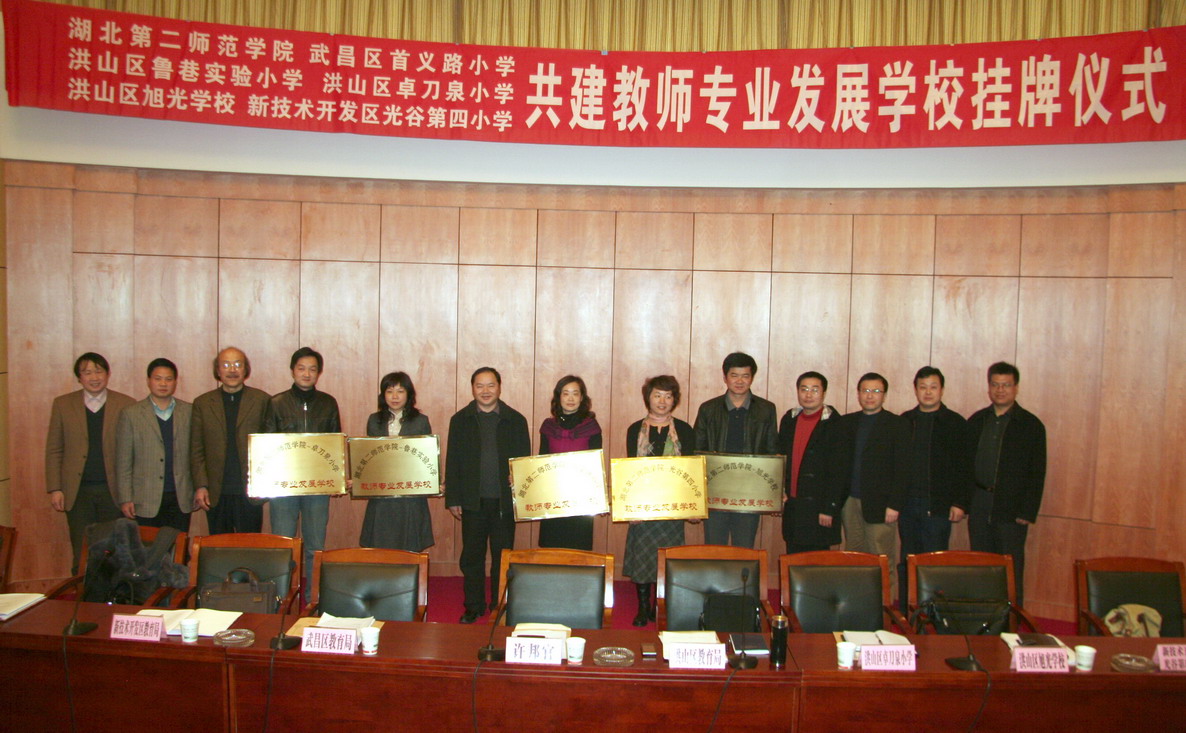 2010年3月17日下午,我校与武昌区首义路小学、洪山区鲁巷实验小学、洪山区卓刀泉小学、洪山区旭光小学、东湖新技术开发区光谷第四小学等五所小学共建教师专业发展学校挂牌仪式在我校行政楼一号会议室举行。五所小学的负责人以及武昌区、洪山区、东湖新技术开发区所在地的教育行政管理部门的领导出席挂牌仪式,我校副校长许邦官等出席此次挂牌仪式,教育与心理科学系负责人、教师代表及小学教育见习小组的学生代表参加。仪式由教务处副处长夏力主持。