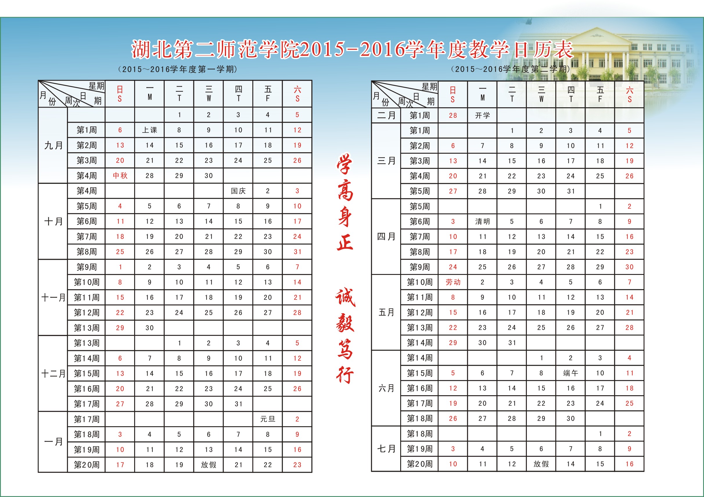 湖北第二师范学院2015-2016学年度教学日历表