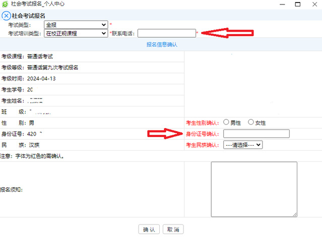 填写核对个人信息:添加电话号码和身份证号码、勾选性别、民族(带红色*为必填项)。